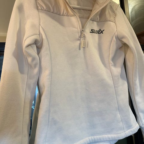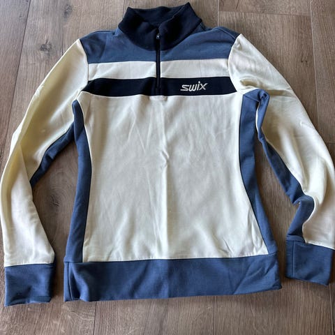 Swix fritidsgenser for turbruk i størrelse XS for kvinner. Genseren har en halv glidelås i front og er hovedsakelig turkis med mørkeblå detaljer på sidene og ermene. Egnet for fotturer og utendørsaktiviteter.