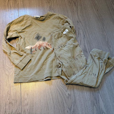 Ulltrøye og longs i merinoull fra Lindex (Fix) størrelse 110/116 i en dus fin grønnfarge med dyreprint. Hull på kneet på ene beinet på strømpebuksa. 200 kr for trøye og 50 for longs.