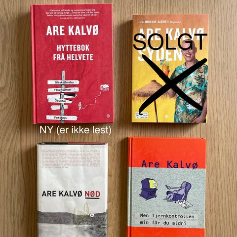 Are Kalvøs to bøker «Syden» og «Meininga med livet». «Syden» er signert av forfatteren på innsiden av omslaget.