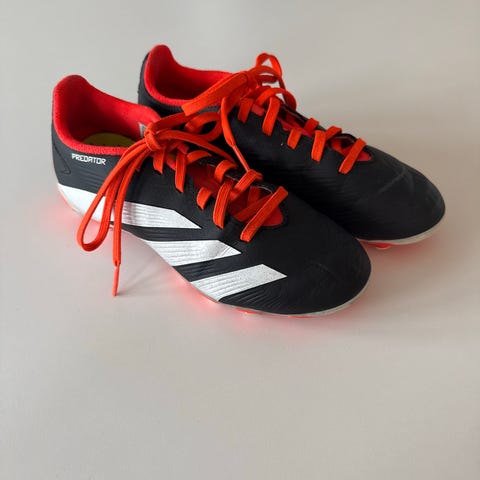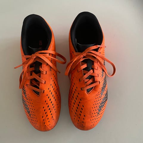 Adidas Predator fotballsko i størrelse 34, farge oransje med svarte detaljer. Laget for barn med knøttlignende knotter under for bruk på gressbaner. Materialet er syntetisk for slitestyrke og komfort. Brukt som fotballsko nr 2 som et tillegg til grus/kunstgresssko. Mye bruk igjen