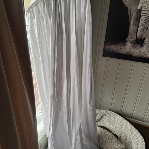 Sengehimmel med i hvitt blondestoff. Passer til barneseng og kan brukes som dekorasjon eller for å skape en lun atmosfære rundt soveområdet.