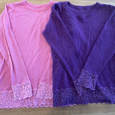 To Bergans ulltrøye i størrelse 104, farge rosa. Laget av 70% merinoull og 30% bambusviskose. Plaggene harforsterkninger på albuer.