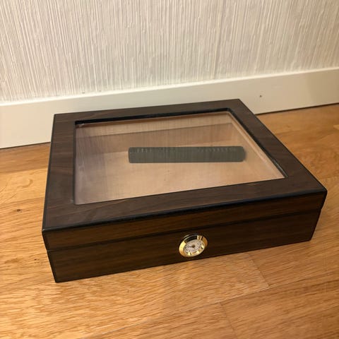Treboks med glass selges. Kan brukes til så mangt som eks, smykkeskrin eller lage nøkkelskap av den og henge opp på en vegg .