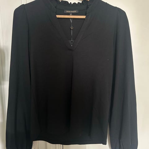 Superfin topp i svart farge, størrelse L for damer. Toppen har detaljerte blonder på ermene og mansjettene, med et v-halsutringning og en løs passform bak. Brukt kun to ganger, da den ble litt for stor for meg.