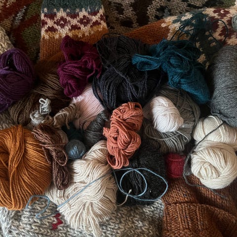 Totalt 431 gram håndfarget merinoull fra ulike leverandører, har ingen merkelapper.