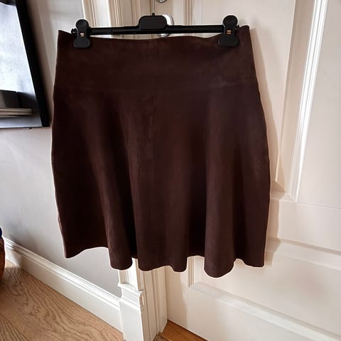 Valentino Jeans skinnskjørt , vintage. Sort farge, størrelse M/L, tror det er det størrelse 42 blir. Skjørtet er laget i en myk og god skinnkvalitet, og har en lomme bak og to foran. Skjørtet er foret og har to splitter foran.
