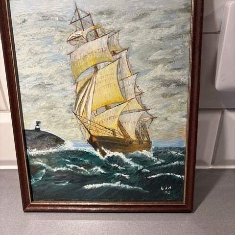 Vakkert bilde med havets naturkrefter! Signatur Gustav Magnussen? Vennligst gi bud! Lengde 66 cm, bredde 48 cm.
