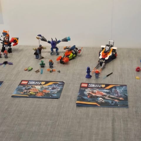 LEGO NINJAGO sett og figurer med ulike kjøretøy, roboter og minifigurer. Inkluderer flere byggesett med manualer, forskjellige farger og materialer i plast, egnet for barn og samlere. Settene inneholder blant annet motorsykkel, helikopter, robot og flere karakterfigurer fra NINJAGO-serien.