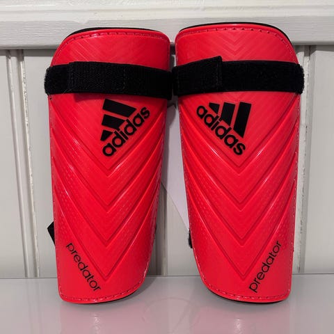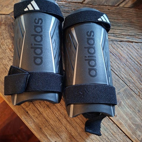 Selger Adidas leggbeskyttere i svart farge. Laget for å beskytte leggene under sport og trening, med justerbare stropper for sikker passform.