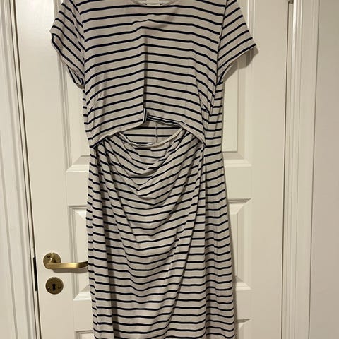 Faller flott rundt kroppen. Omslagsliv. Kan brukes som vanlig kjole også, og som svangerskapskjole.