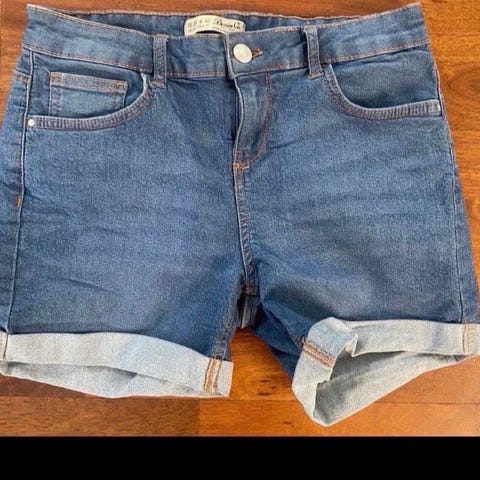 Dame jeansshorts i blå farge, størrelse 38. Laget av denimmateriale med knappelukking foran og to lommer bak. Shortsene har oppbrettede ben.
