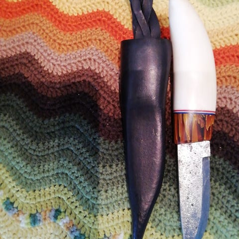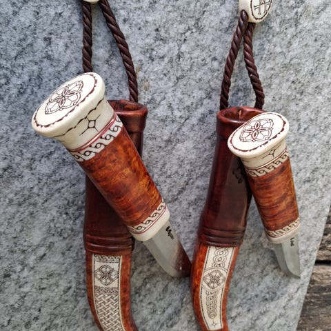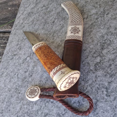 Hewter Haugrud Fiske kniv med dekorert slire og trehåndtak