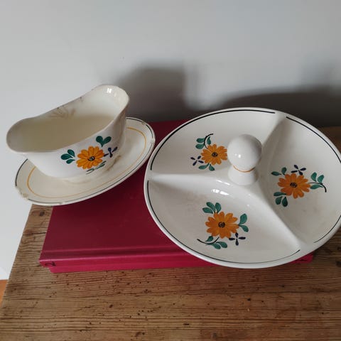 Egersund serviset SOLSIKK bestående av tallerkener, skåler og sauskanne med gul og blå blomsterdekor. Tallerkenes diameter er omtrent 33cm. Serviset er laget av keramisk materiale og har en klassisk design med dekorative blomster.