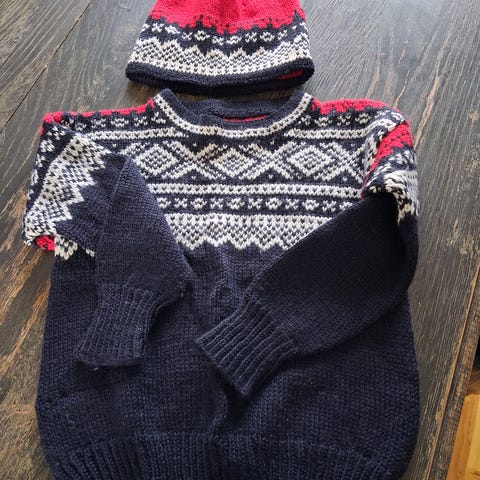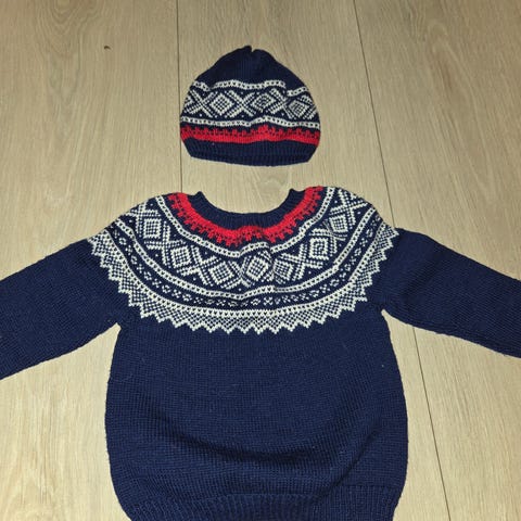 Flott hjemmestrikket Mariusgenser i ullgarn, ca. 3-4 år. Tilhørende lue følger med. Mål over brystet, målt under ermene 31 cm og lengde fra skulderen og ned 46 cm. Genseren er brukt et par ganger og ser helt ny ut. Samlet pris 450 kr. Kan sende på den måten kjøper ønsker: fiksferdig ev. PostNord til 69 kr - sporbar og forsikret.