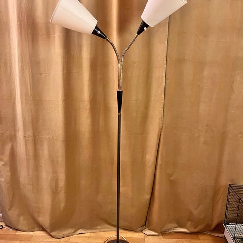En eldre gulvlampe med flott leselys. Retro AJH.6. PAT. Bruksmerker men fungerer utmerket. Selges for 500 kr eller høystbydende. Liker du eldre lamper og i retro stil er dette lampen for deg.