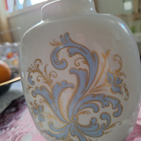 Dette er en Royal Copenhagen porselensvase med lokk, med et blått og hvitt blomstermønster