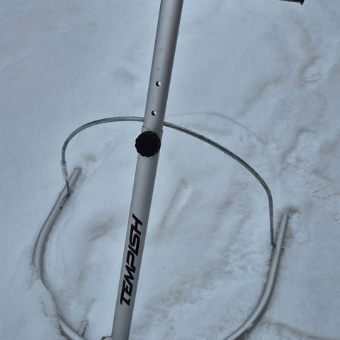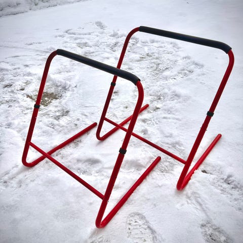 Rødt trenningstativ laget av metall.Kan brukes både innedors og utedørs