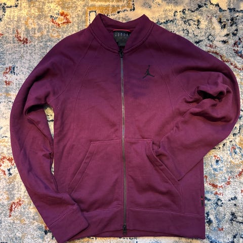 Nike Jordan hettejakke i størrelse S. Jakken har beige farge med svarte og hvite detaljer, og er laget av lett materiale med glidelås og hette. Passer til utendørs bruk og gir beskyttelse mot vær. Lommer på siden og snøring nederst,