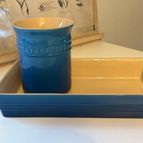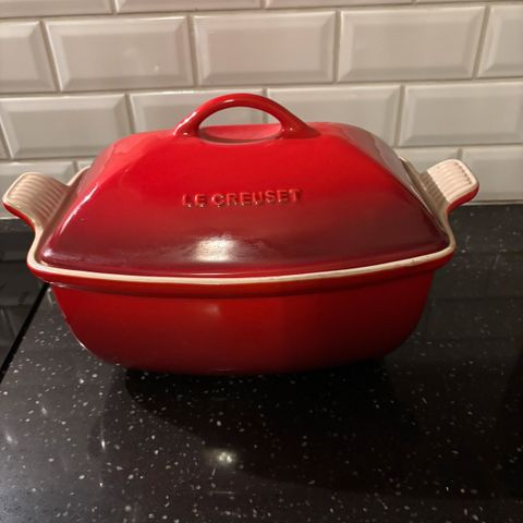 Le Creuset brødform i keramikk. Brødformen har en rektangulær form med lokk, designet for baking av brød. Materialet er keramikk, som gir jevn varmefordeling under steking.