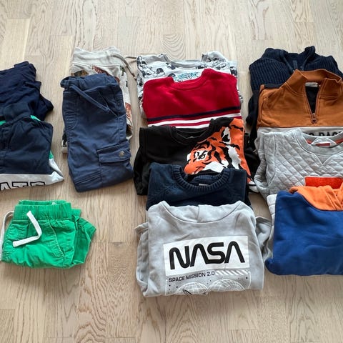 Selger en alsidig klespakke i str. 98â104 med 19 plagg. Passer til gutt ca. 2â4 ĂĽr.