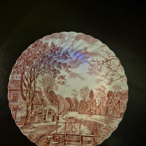 Plettfrie veggtallerkner fra Johnson Bros med landlig motiv fra England. Selges for kr 200,- pr stk.