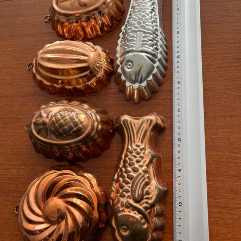 Et større utvalg av eldre og nyere kobberformer, for matlaging eller bare til pynt. Alle kommer med opphengsringer.