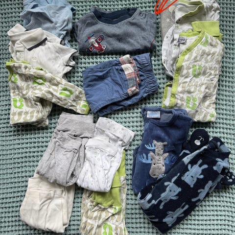 Klespakke str 68- grå heldress i bomull med praktiske knapper i beina. Enkel å få på og av. Joggedress blå/beige med bamsetrykk. Tre bodyer med forskjellig print, disse er litt mer brukt enn resten. Tre joggebukser fra Kaxs, Freds World og Polarn O Pyret. Kan sende, kjøper betaler frakt.