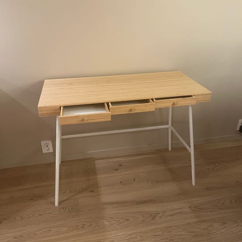 Selger IKEA Lillåsen skrivebord. Nypris 2295, 102x49cm. Pent brukt og selges pga flytting, bare å sende meg melding om du lurer på noe! Har et merke fra en tekopp eller vannglass i venstre hjørnet på toppen, men det synes så ikke så godt utenom i sollyset. Må hentes hos oss i Trondheim