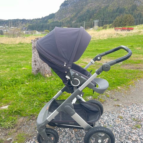 Stokke barnevogn med svart ramme og sete. Passer for barn og har justerbart håndtak. Designet for komfort og funksjonalitet.