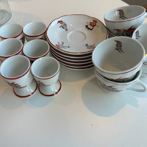 8 kuverter med kaffeservise med asjetter, kopper og skåler selges samlet. De er lite brukt, og feilfrie. Asjettene er 21,5 cm i diameter. Koppene 9 cm og skålene 14 cm. Serviset må hentes.