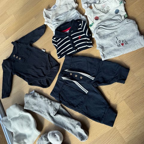 H&M Barneklær Pakke med flere plagg i størrelse 56. Flerfarget utvalg av klær for unisex barn, inkludert heldresser, bodyer, bukser og gensere. Materialene varierer, egnet for daglig bruk og ulike anledninger.