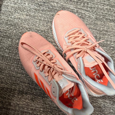 Adidas sko i størrelse 40, brukt kun noen få ganger. Designet med hvit og rosa fargekombinasjon. Skoene har en kombinasjon av tekstil og syntetisk materiale, egnet for ulike sportstyper. Sålen har mønster for grep og støtte.