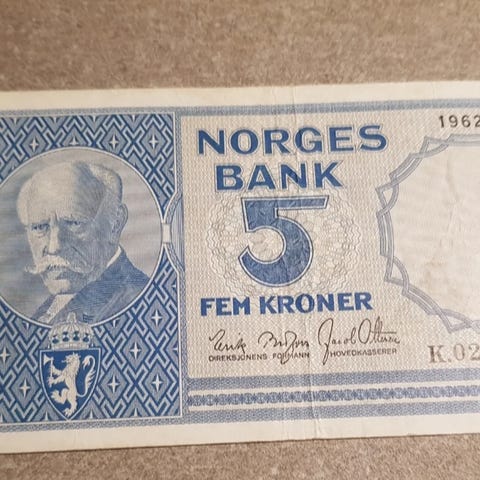 5 kr seddel, MEGET PEN NÆR usirkulert 1962 Serie J (4012 BP)