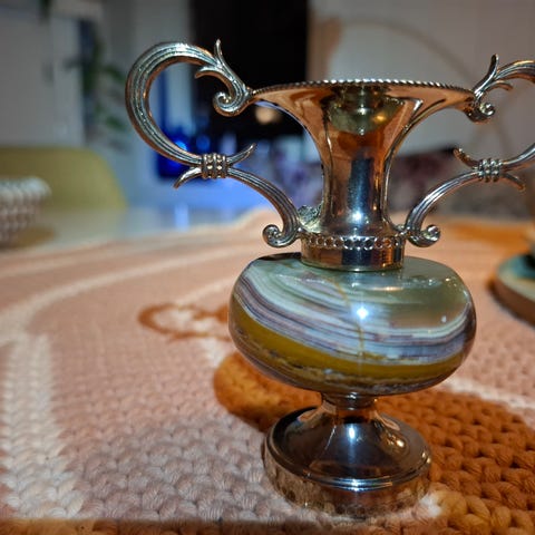 Ronson bordlighter laget av tenn med dekorative elementer i emalje i blå farge. Kompakt design med detaljer i metall. Egnet som samlerobjekt eller dekorativ gjenstand.