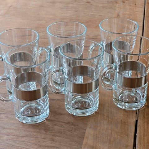 Glasskrusene er 11 cm høye med en metallring på midten.