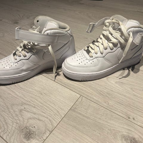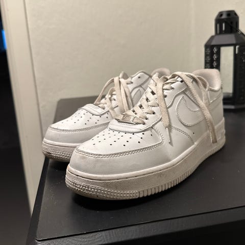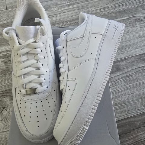 Nike Air Force 1 sneakers i hvit farge, størrelse 41. Laget av lærmateriale med perforeringer på tåpartiet for ventilasjon. Har klassisk design med lav profil og gummisåle for godt grep. Egnet for daglig bruk og fritidsaktiviteter. Følger bare med boksen.