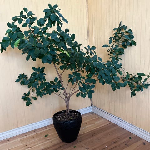 To stueplanter: en drageplante med tykk stamme og lange grønne blader, og en arekapalme med tynne, fjærlignende grønne blader. Begge planter er plassert i potter og egner seg til innendørs bruk som dekorative elementer.