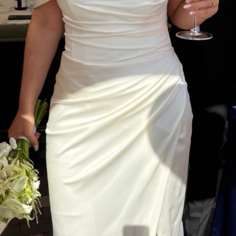 Kjolen er tung og god i stoffet og veldig behagelig å ha på seg. Jeg er 175 cm høy og brukte tilnærmet flate sko i bryllupet. Kjøpte kjolen privat av en annen dame og den måtte legges opp av skredder til min høyde.