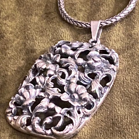 Antikk sølvanheng. Vurderingsverdi 830. Lengde 28 cm. Ser svært verdig og nobelt ut.