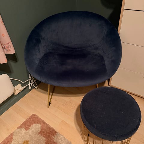 Selger en pen og solid lenestol i mørkegrønt stoff ( fløyelspreget trekk).