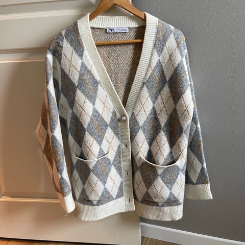 Nypris er ca. 380kr. Zara Cardigan i flerfarget design, størrelse S. Strikket med knappelukking foran og krage. Passer for kvinner.