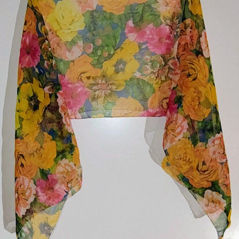 Pent og lite brukt regnbueskjerf. Solgt til meg som Pashmina, men det kjennes ut som viskose. Mykt og godt, skinner litt i sola.