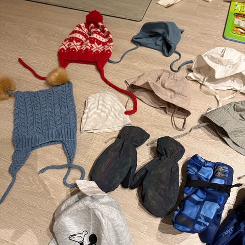 Pakken inneholder 6 hatter og luer, 4 av dem med knyting under haken, én "pyntelue", to av solhattene har solbeskyttelse for nakken og ryggen.