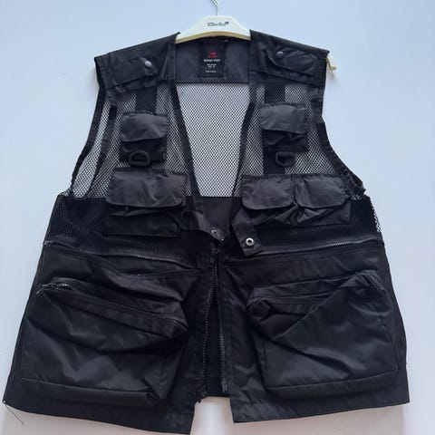 Sports Club XL fiskevest i brun farge. Vesten har flere lommer foran og bak for oppbevaring av utstyr. Laget i slitesterkt materiale, uten ermer, med glidelås foran og knapper på skuldrene. Egnet for friluftsliv og fiskeaktiviteter.