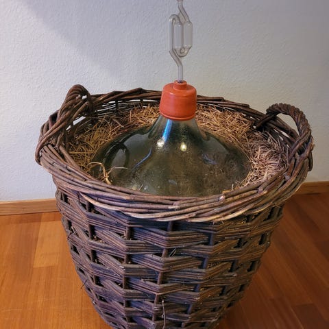 Vinballong i glass og kurv med dekorlys og vinballong-gummitopp