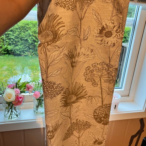 Brukt i kun 3 måneder i sommer. Små merker fra hengesystemet, men de er ikke synlige når gardinene henger oppe. Ikke forsøkt vasket. Selges sammen med hengeringer .Selges fordi stilen i rommet er endret.