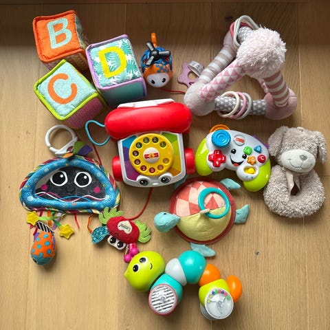 En kasse med babyleker. Rangler, biteleker, tv, speil, myke bøker, puslespill.