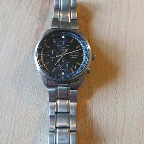 SEIKO herreur Chronograph water resist 100 m selges rimelig. Uret er pent brukt, men noen synlige bruksmerker er det.