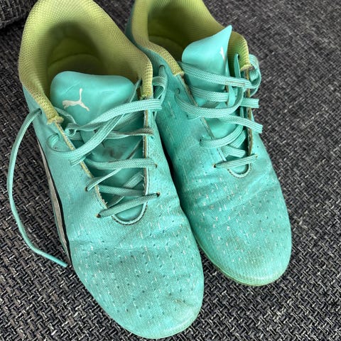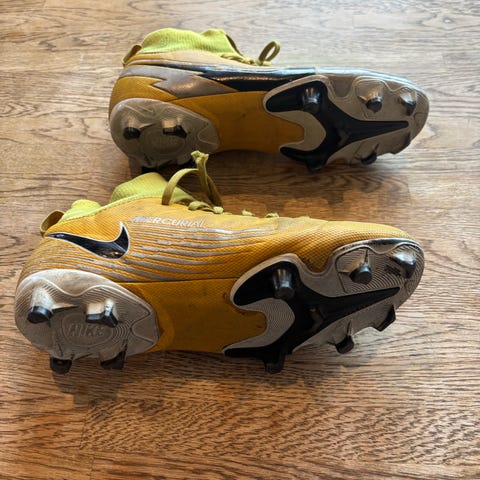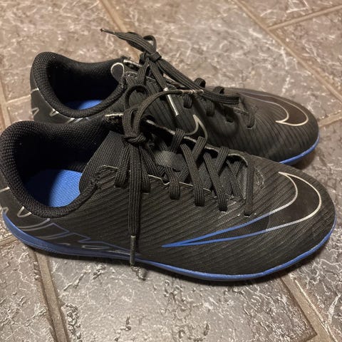 Nike fotballsko i blå farge, størrelse 35. Skoene har knotter for bedre grep på gressbaner og er laget i syntetisk materiale for holdbarhet og lett vekt.