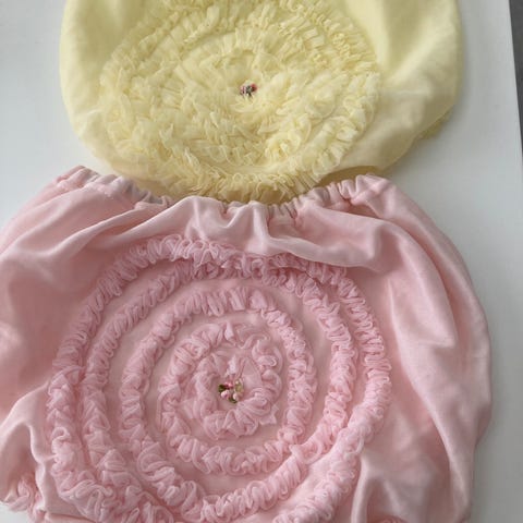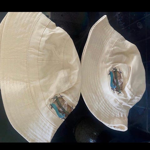 2 stk bade/solhetter selges for 55,- pr stk. Pent brukt, viser liten slitasje/merker etter pent bruk. Begge er str 98/104, men vi brukte disse lengre enn størrelsen tilsier.